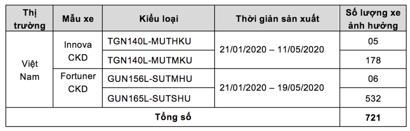 Theo thông báo chương trình triệu hồi này, các xe Toyota Innova và Toyota Fortuner thuộc diện triệu hồi được được sản xuất trong khoảng thời gian từ 21/1 đến 19/5/2020. Tất cả các xe này đều trang bị hộp số tự động. Theo lý giải của công ty, do có sai sót trong quá trình lắp ráp, bu lông (gồm 6 chiếc) dùng để bắt chặt đĩa dẫn động vào biến mô có thể không được siết đủ lực tiêu chuẩn, tiềm ẩn nguy cơ lỏng ra khi xe vận hành.