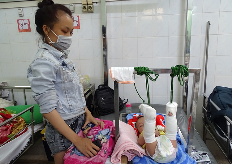 Cụ thể, Chiều 6/2, tại Khoa Chấn thương chỉnh hình Bệnh viện Nhi đồng 2, bé Châu Minh Khôi (4 tháng tuổi, ở quận 9, TP.HCM) được các bác sĩ treo hai chân bó bột lên cao để theo dõi, gương mặt vẫn hằn những vết bầm tím. Đêm 3 hôm trước, Khôi được cha ruột là Châu Minh Tiến (24 tuổi) đưa đến bệnh viện trong tình trạng bị nhiều vết thương ở chân và mặt. Anh ta nói bé bị ngã khi nằm võng.