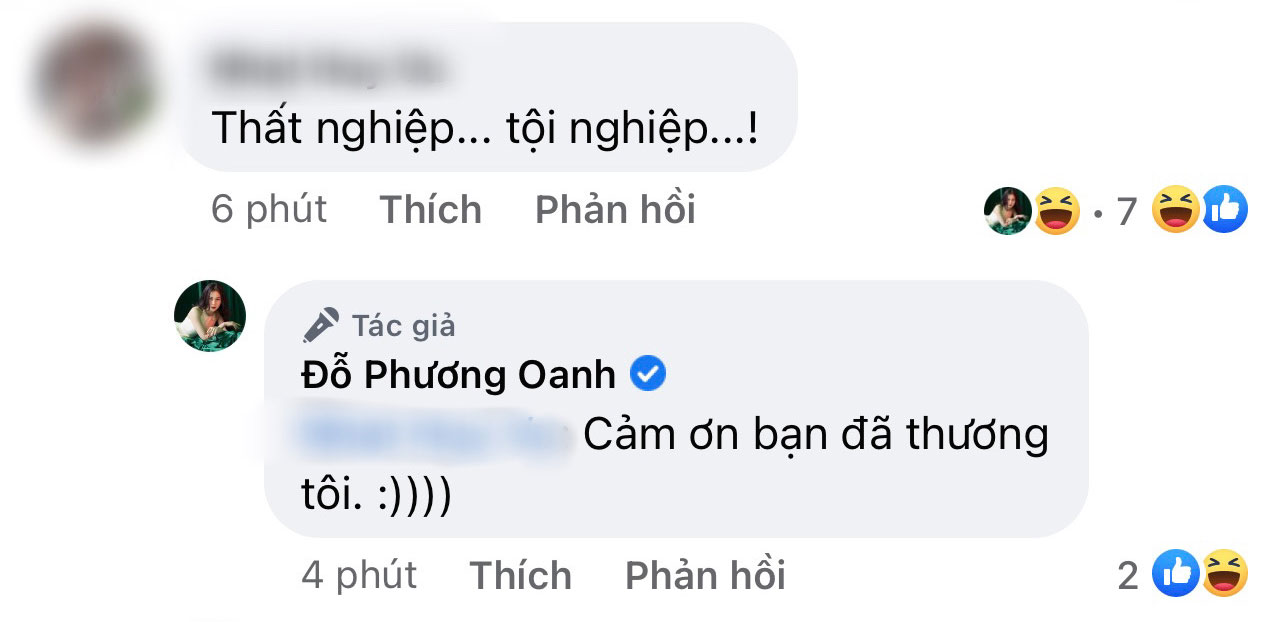 Chuyện sẽ không có gì đáng nói nếu như bạn gái Shark Bình không nhận được những bình luận mỉa mai từ antifan, cho rằng cô "thất nghiệp", "dùng lại đồ thừa của người khác" hay là "con giáp thứ 13". Trước những ý kiến tiêu cực, Phương Oanh không ngần ngại lên tiếng đáp trả. Tuy nhiên, khác với những lần trước, thay vì "nổi đóa" mắng thẳng mặt netizen kém duyên thì lần này, nữ diễn viên chỉ buông lời nhẹ nhàng: "Cảm ơn bạn đã thương tôi", "Làm việc đi em, xong còn lo cơm nước, chồng con giặt giũ nữa đi kìa", "Ngủ đi em, mai còn đi lễ",...