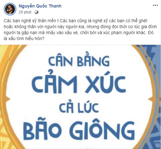 "Các bạn nghệ sĩ thân mến! Các bạn cũng là nghệ sĩ, các bạn có thể ghét hoặc không thân với người này người kia, nhưng đừng đợi thời cơ lúc gia đình người ta gặp nạn mà nhảy vào xâu xé, chửi bới và xúc phạm người khác. Đó là xấu tính hiểu hôn?", Ưng Hoàng Phúc viết.