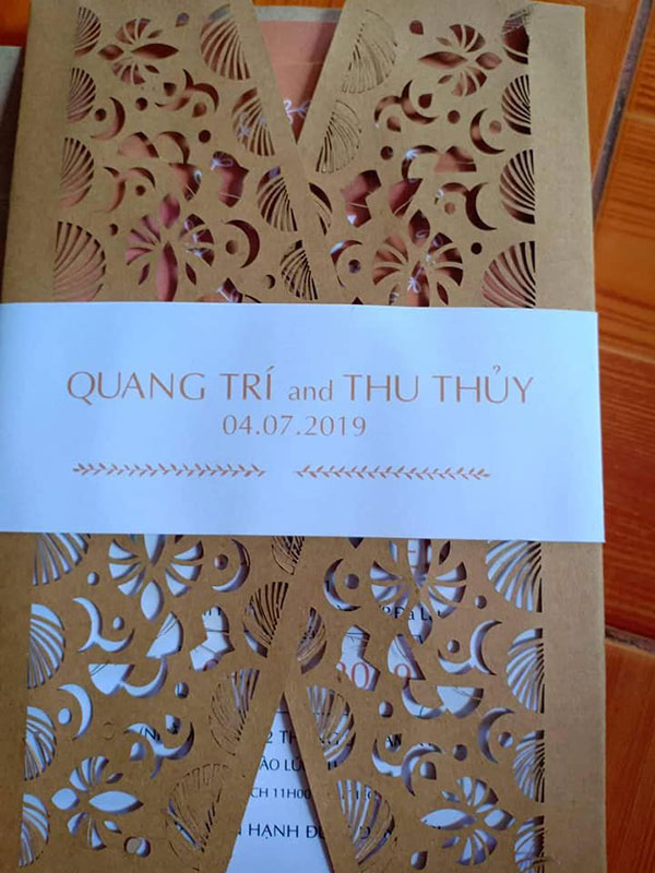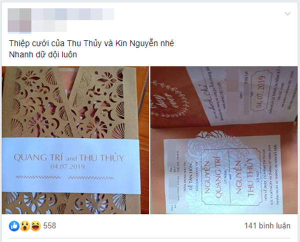 Theo đó, một dân mạng có tên Đ.N.H.T đã đăng tải bức ảnh 1 chiếc thiệp cưới của cô dâu Thu Thủy - chú rể Quang Trí và cho biết: "Thiệp cưới của Thu Thủy và Kin Nguyễn nhé! Nhanh dữ dội luôn."